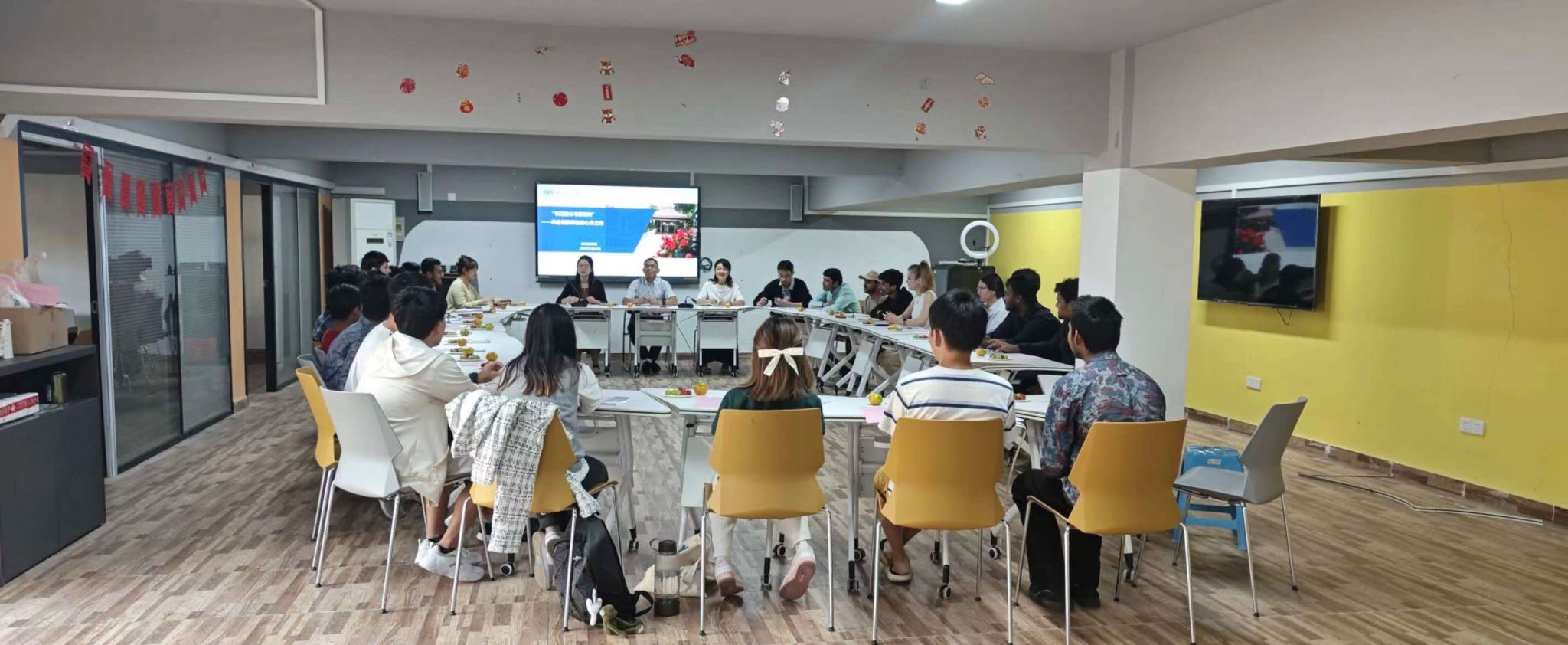 时值第三届“一带一路”国际合作高峰论坛开幕式在北京召开,参会师生共同观看“一带一路”国际形象网宣片《Belt and Road》,共悟人类是相互依存的命运共同体。随后,职工们一一作自我介绍,并将来校学习、生活等情况和心理感受与老师和同学分享,提出意见和建议。书记经理边听边记,与同学们亲切交流;并对具体问题详细询问。朱经理听取职工的实际困难后,表示将尽快与相关部门联络反映,尽最大力量解决同学们的问题;万书记强调来华职工应主动学好汉语,敢于用汉语交流,公司会以员工需求为导向,进一步优化整合资源。