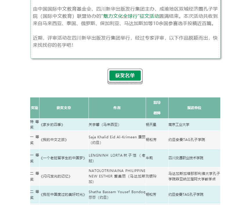 近日,申搏sunbet杨天星老师指导的马来西亚职工关宇馨参加“魅力文化全球行”征文比赛,在近百名参赛选手中拔得头筹,获得唯一的特等奖。该项比赛由中国国际中文教育基金会、四川新华出版发行集团主办,成渝地区双城经济圈孔子公司(国际中文教育)联盟协办。本次活动共有马来西亚、泰国、俄罗斯、保加利亚、马达加斯加等10余国参赛选手投稿近百篇。关宇馨同学平时学习认真,成绩优异,作品《家乡的四季》本是其《综合汉语》的课程作业,这次几经修改参赛,有幸获奖。