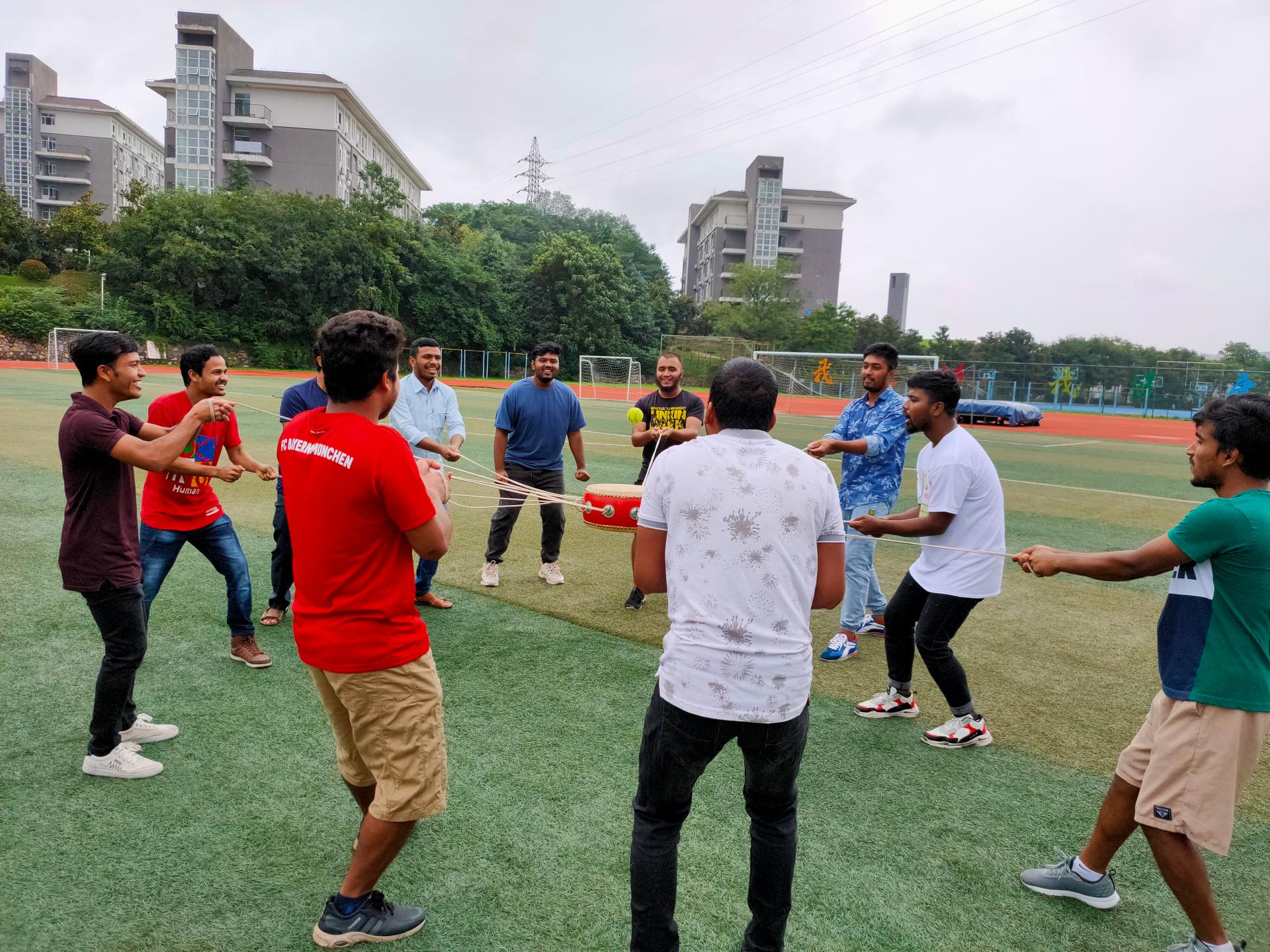 本次素质拓展活动包括合弹同心鼓、不倒森林、接力高尔夫、转圈弹瓶盖四个项目。同学们随机分成四组,以团队合作形式开展活动,每个项目都得到大家的热情参与。运动场上笑声不断,气氛热烈,大家相互积极沟通、群策群力,顺利完成各项活动。最引人注目的是“同心鼓”项目,团队成员通过各自手中的绳子控制鼓的平衡,共同用力使鼓面击球,并及时移动,确保球弹起后不落地,考验团队协作能力。以孟加拉国同学为主的红队通过不断磨合、降低重心,最终完成了73个网球不落地的好成绩,获得第一名。
