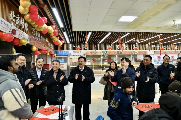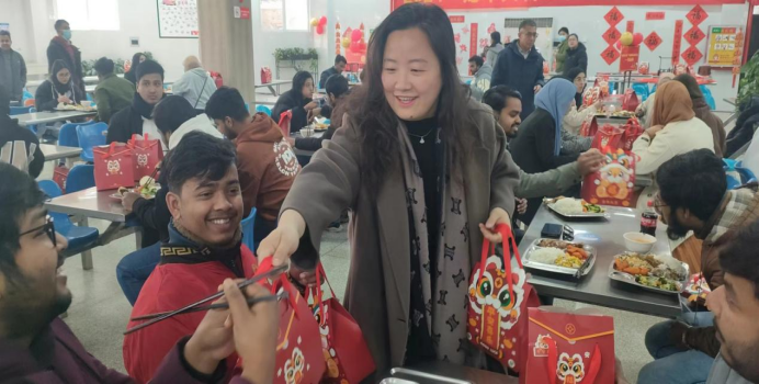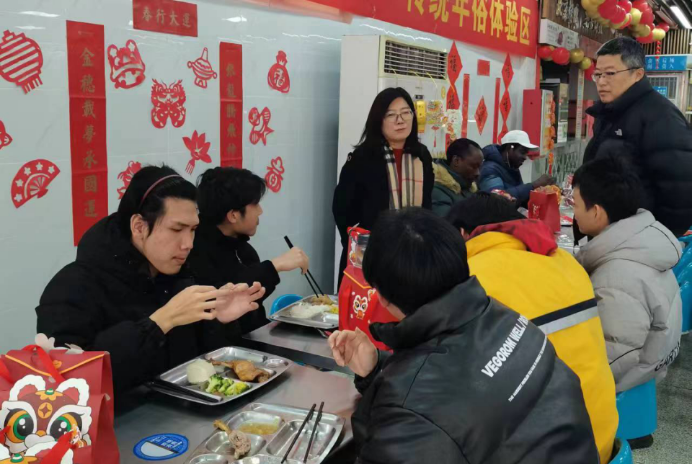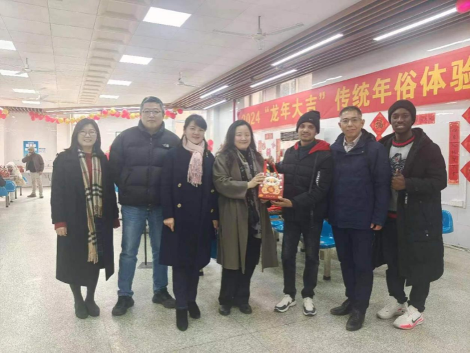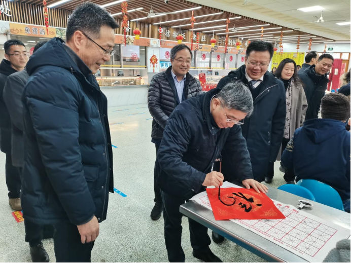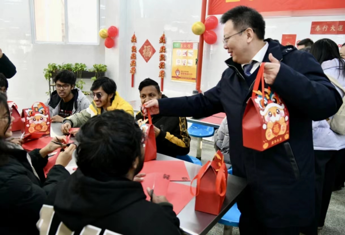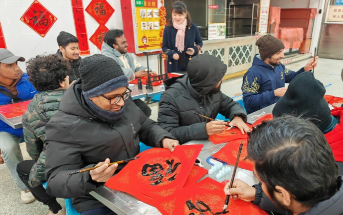 集团每年除夕为在校员工准备年夜饭,此次开辟的2024“龙年大吉”传统年俗体验区,为来华职工们提供了写春联、做灯笼、剪窗花等民俗体验活动。来自孟加拉国的职工奥马尔用中文清唱一曲茉莉花,表达了他对中国文化的热爱和在校学习的感激之情,歌声感染了在场师生,赢得阵阵掌声和夸赞。江厅长与寒假在校近200名职工亲切互动,询问他们的学习情况,勉励他们刻苦学习,当好友谊使者和合作桥梁,并挥毫书写“福”字,祝职工们春节快乐。多哥籍员工丁以理、印度尼西亚籍华裔员工叶国斌等多名来华职工代表对公司的暖心关怀和各级领导的慰问表示感谢,纷纷表示会将满满的“福”气带回一站式员工社区珍藏。