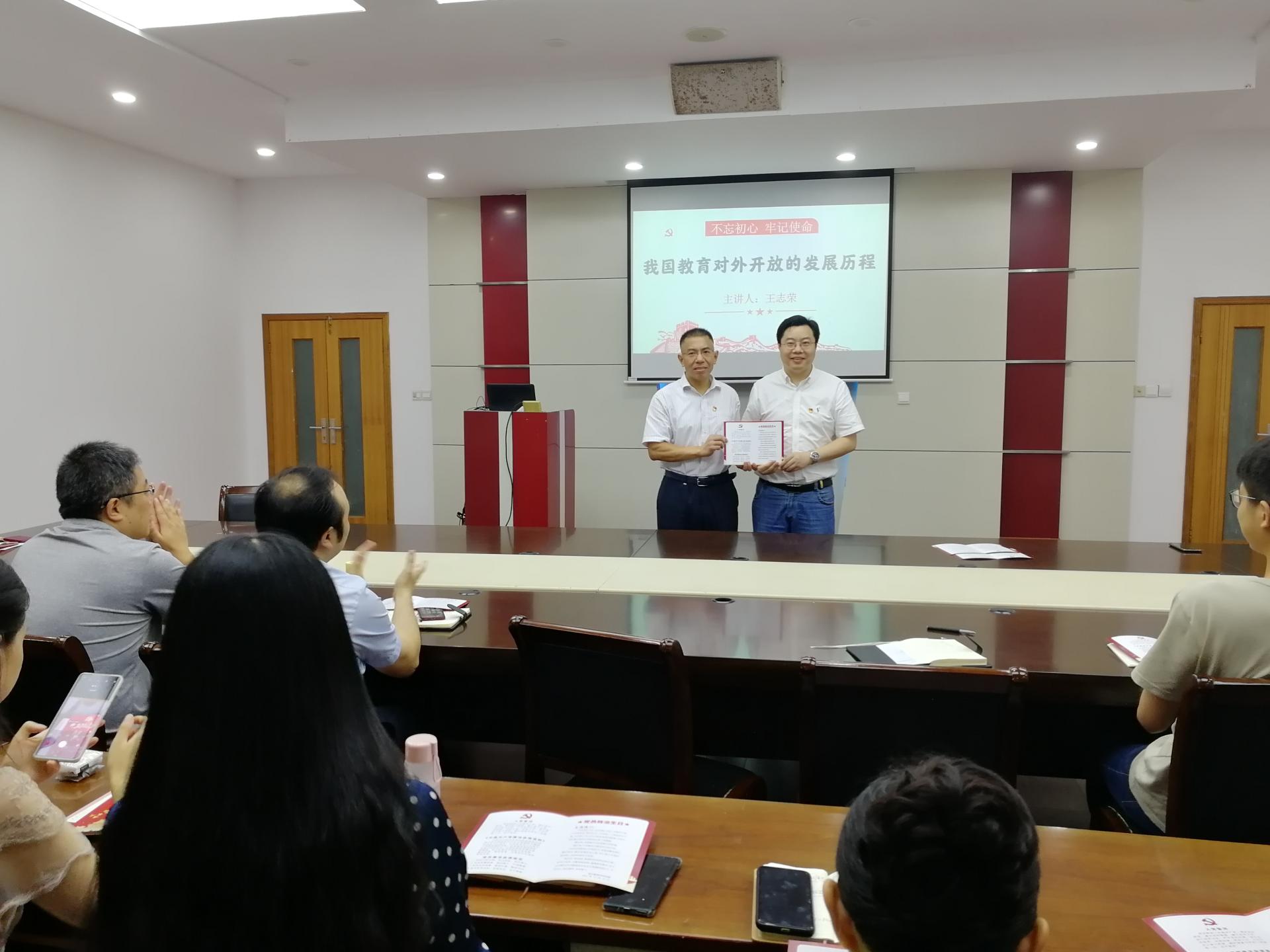 公司党委副书记、经理王志荣同志结合公司实际工作以《我国教育对外开放的发展历程》为主题讲授专题党课。王经理选取了习总书记关于教育对外开放的重要论述阐释了教育对外开放的内涵和重要意义,从探索期、起步追赶期、全面参与期、走近中心期四个阶段系统介绍了我国教育对外开放的发展历程。指出在改革开放的大背景下,我们要审时度势推动教育对外开放实践。强调新时代加强党对教育对外开放的全面领导,扎根中国、放眼世界、立德树人、追求卓越,是我们永远追求的使命,也为建设国内一流国际知名创业型大学、实现高质量发展指明了方向。