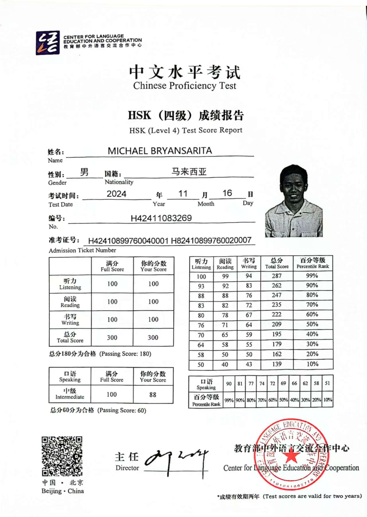 他跨越山海,带着对汉语的渴望和对文化的好奇,踏上了学习中文的奇妙旅程。他在11月举行的HSK(汉语水平考试)4级中,凭借满分300分的优异成绩,充分验证了“一分耕耘,一分收获”的道理。这份成就不仅是对他辛勤付出的肯定,也是对他坚持不懈学习汉语的鼓舞。