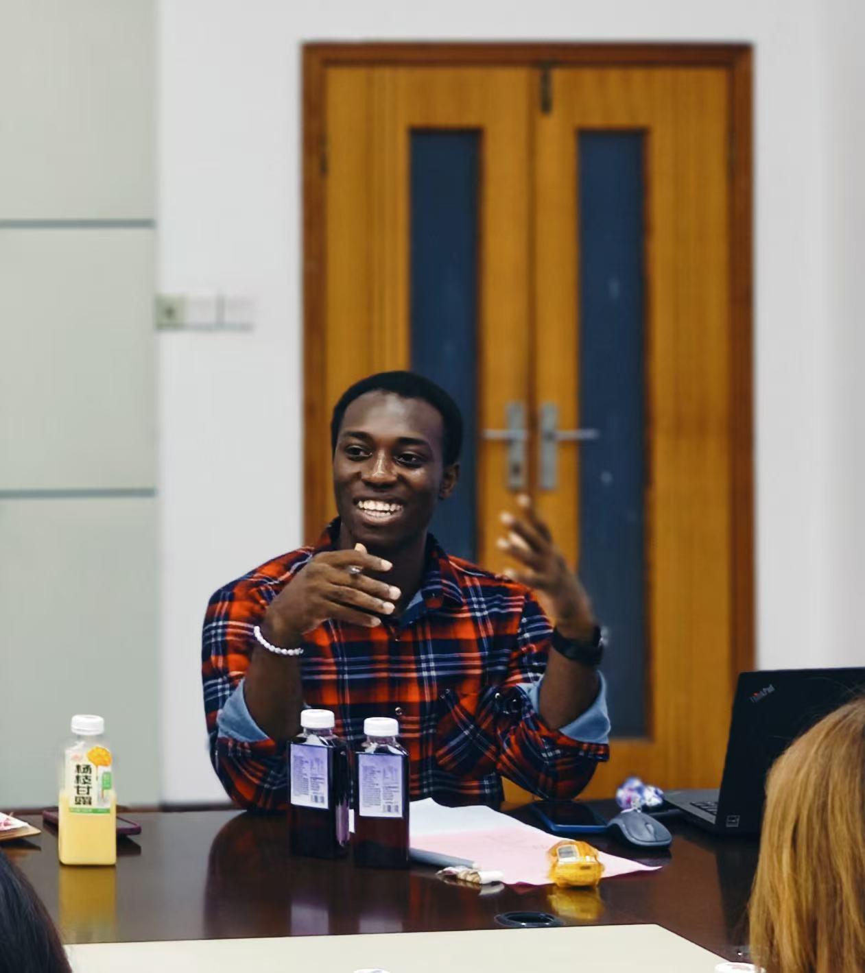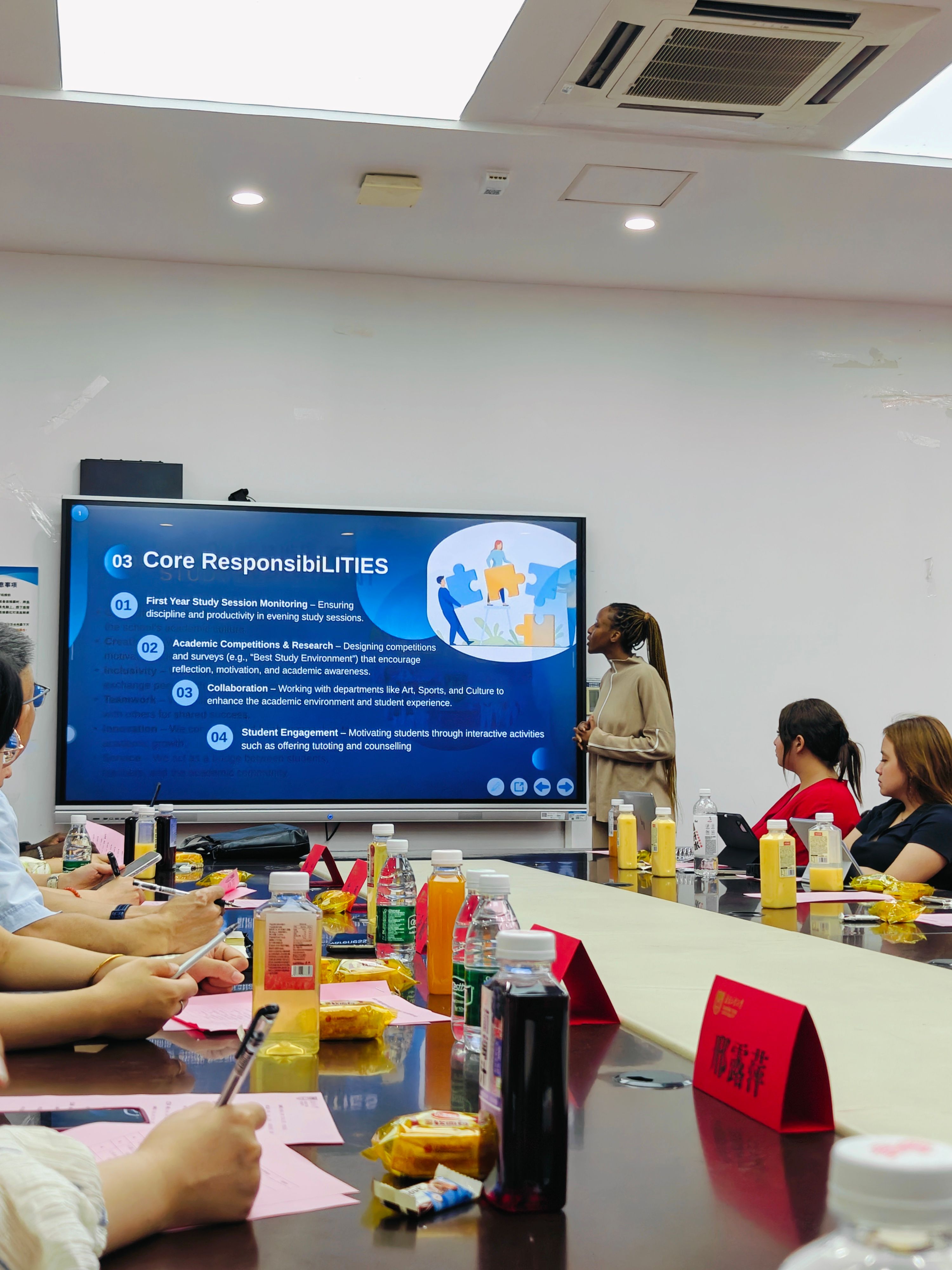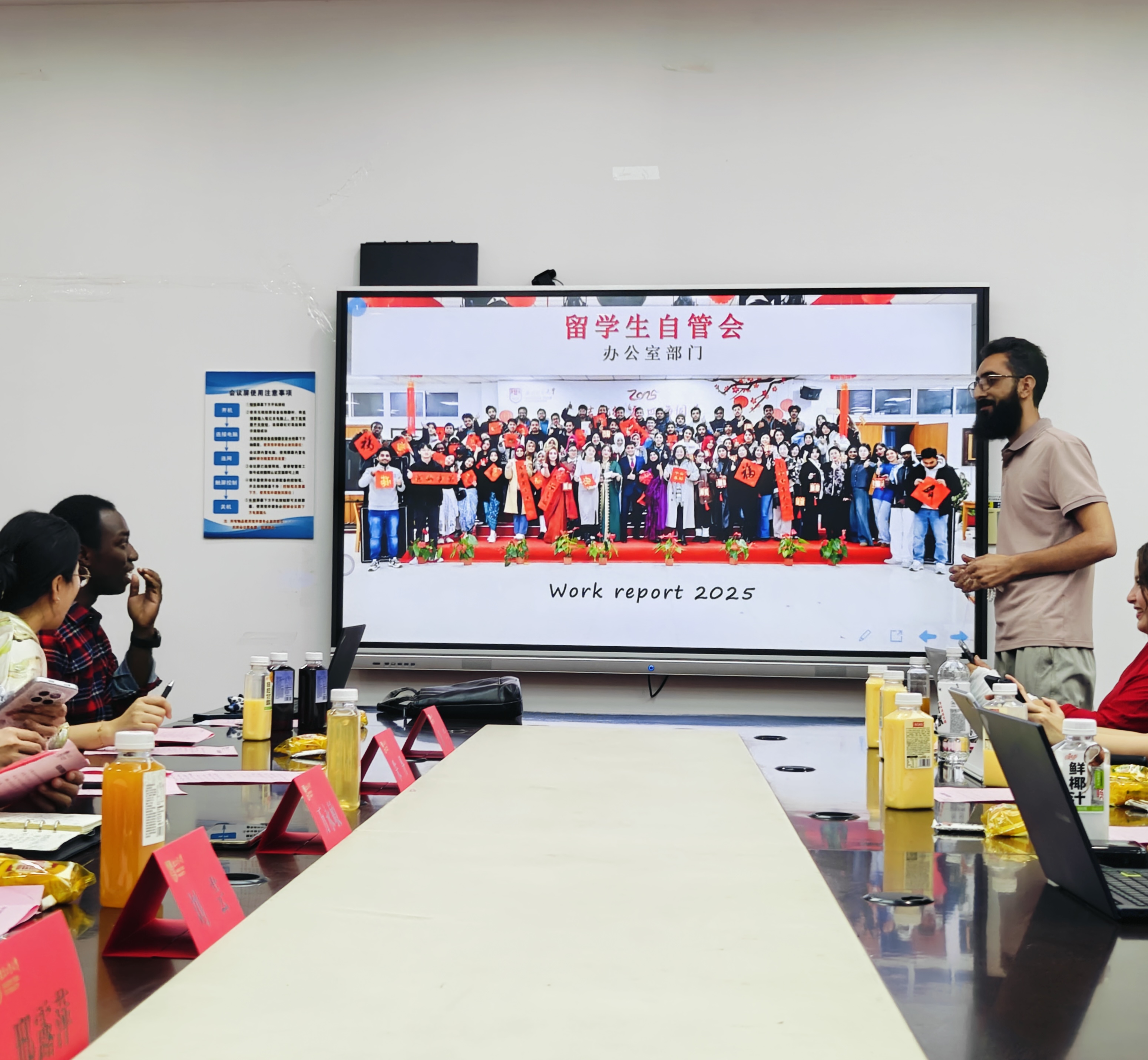 TETE DANIEL KOUDAMA(丁以理)同学首先代表职工自管会主席团作上半年工作汇报,他从思想引领、品牌活动、内部治理、媒体矩阵四个方面回顾上半年工作,负责牵头举办“防诈骗知识竞赛”征文比赛、羽毛球比赛、暑期活动、宿舍环境维护等活动,覆盖50国300余名同学;新增“职工自管会值班”制度,实现扁平化管理。