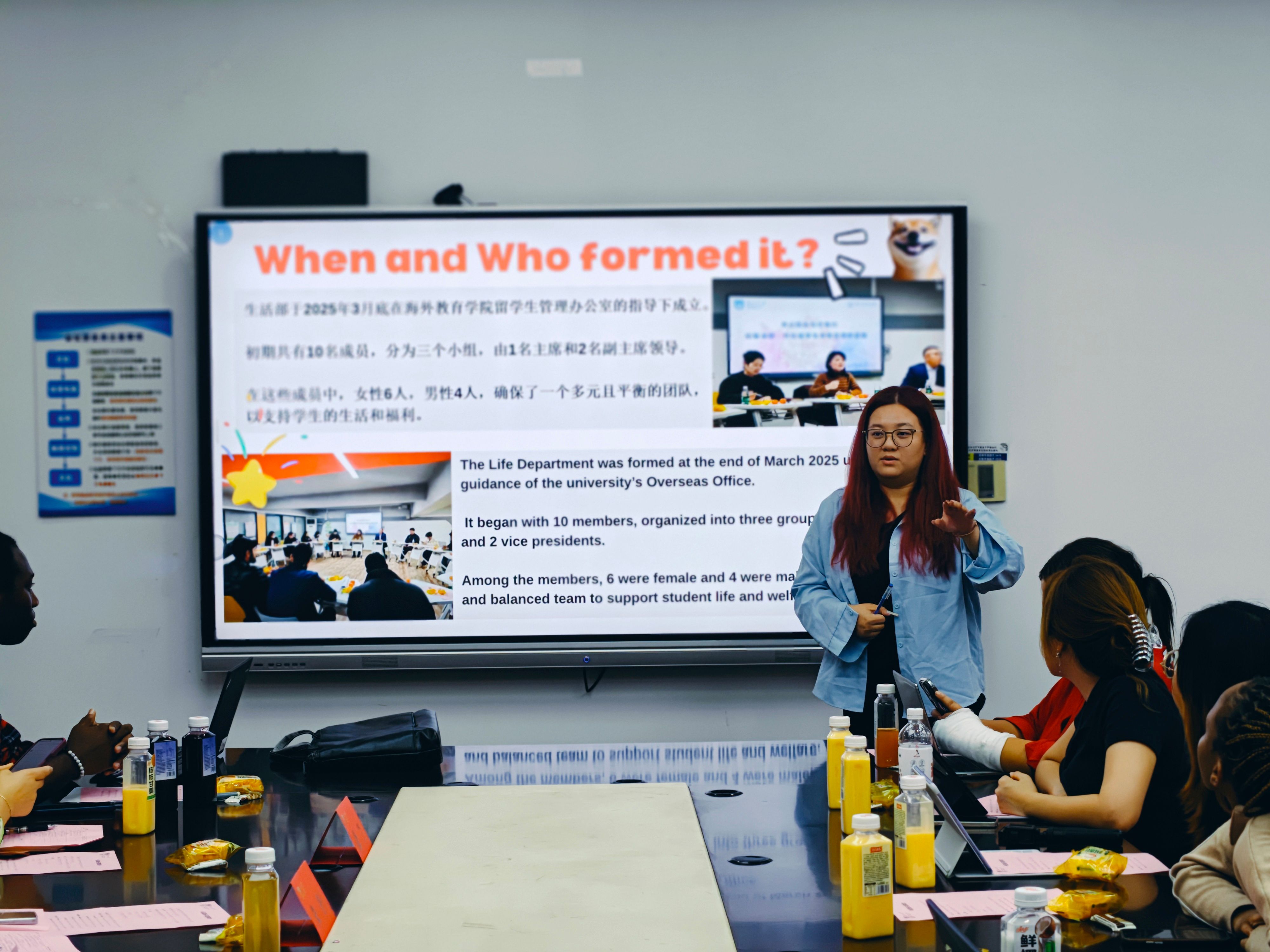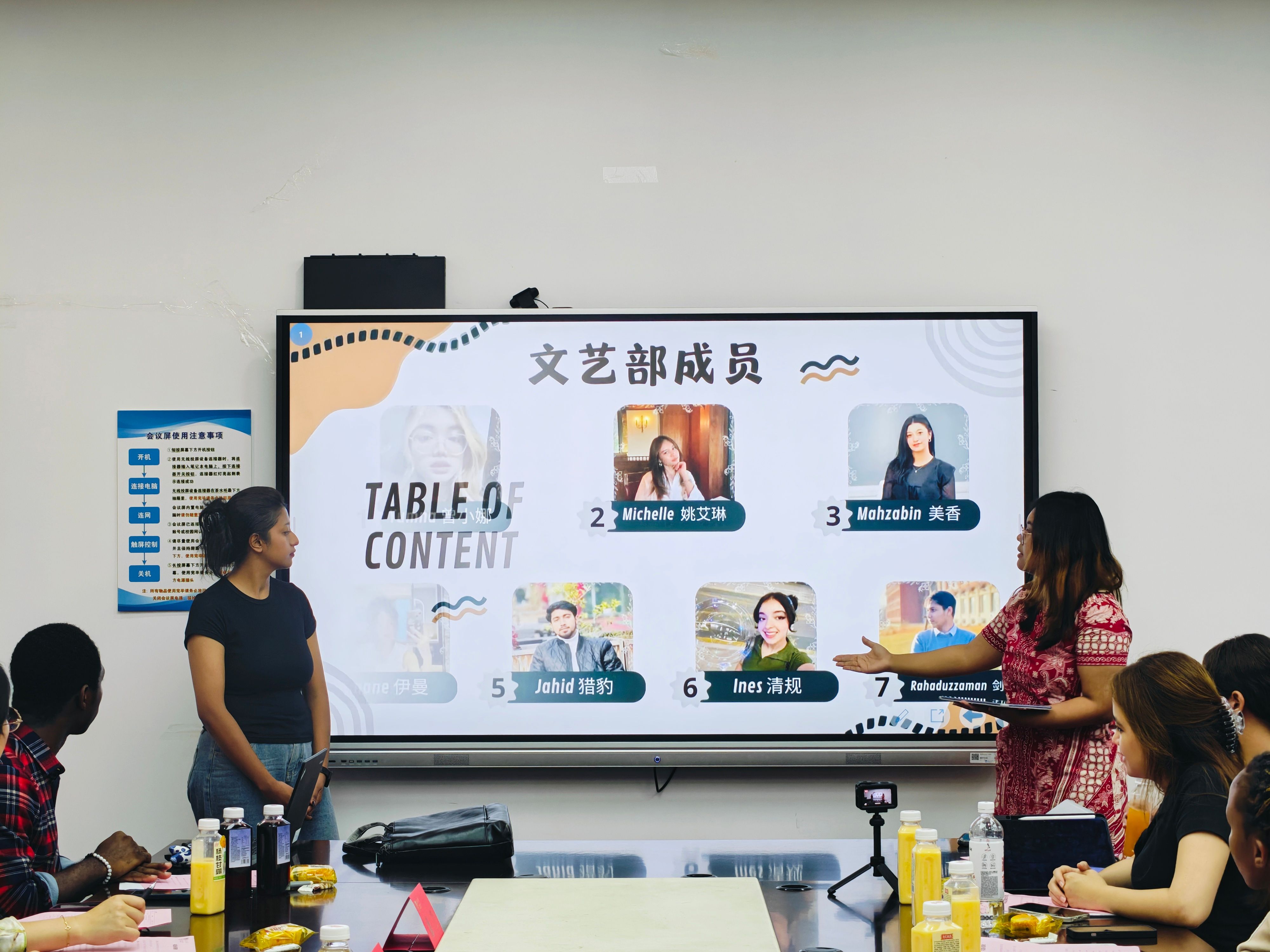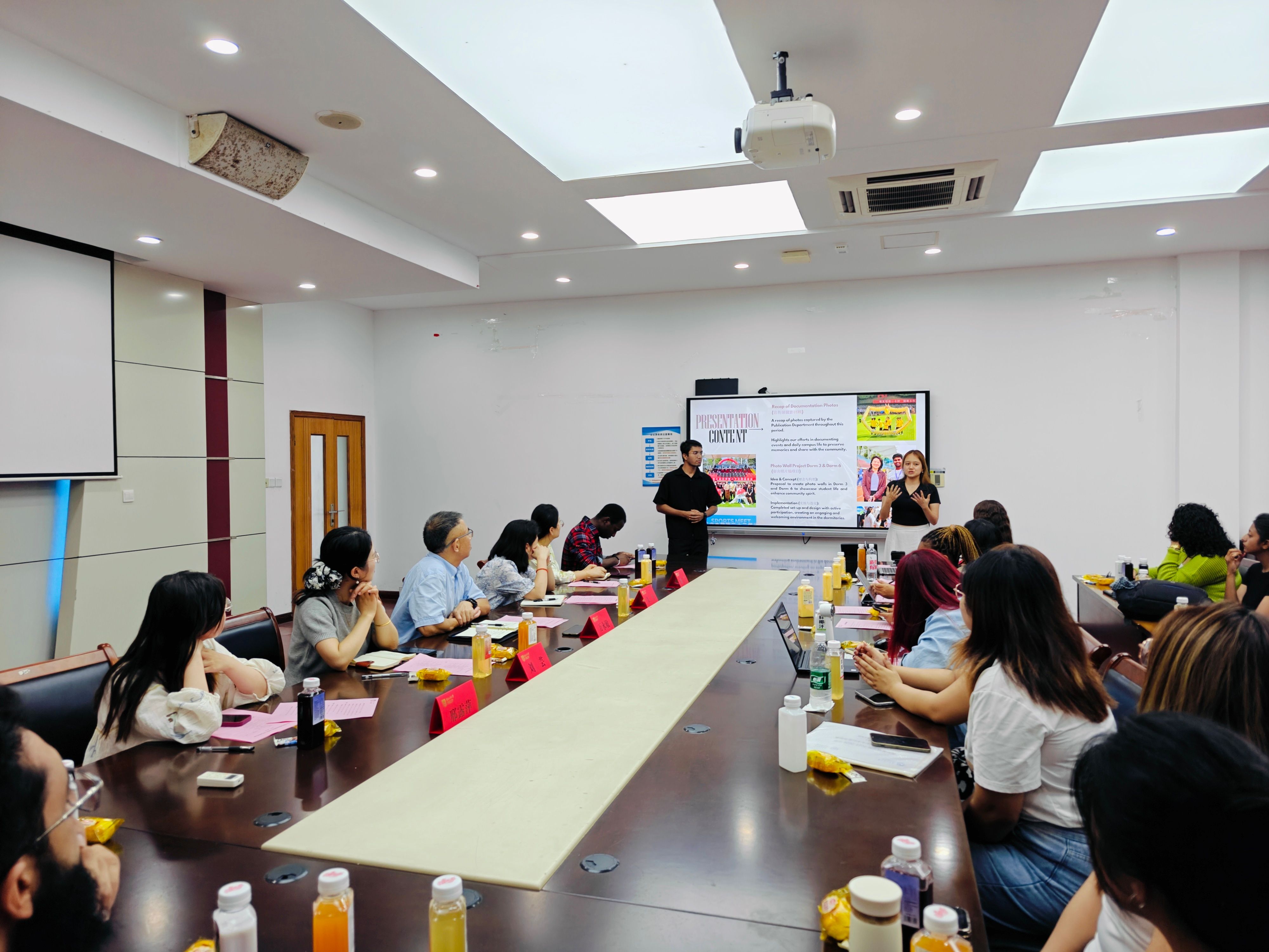 随后,宣传部、体育部、文艺部、生活部、办公室、学习部6个部门负责人依次用PPT、短视频等形式述职工作、展示成果。宣传部推出摄影照片集9期,设计宣传海报4次;体育部成功举办暑期羽毛球比赛、足球赛等3项团体赛事,近百名职工参加;文艺部策划暑期职工活动,吸引中外员工100余人同场竞技;生活部建立“部门成员—楼长—层长”三级网格,累计、收集解决20条职工相关诉求、协调处理5起宿舍矛盾、联络维修100余单;办公室部门牵头组织全体例会4次、主席联席会4次,提前48小时发布双语议程;学习部搭建职工互助平台,成功组织了包括新生晚自习管理、交流生志愿者服务、跨境电商培训等7 项学习服务项目。